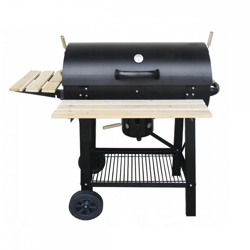 A nagyméretű grill hengeres és zárható fedéllel rendelkezik. A faszéngrill fedele hőmérővel rendelkezik, és képes a levegő áramlásának beállítására, ami lehetővé teszi az ételek tökéletes elkészítését. Funkcionális előny az összecsukható fa polcok és az alsó rács, amelyek megkönnyítik a grillezést és a praktikus kiegészítők tárolását.