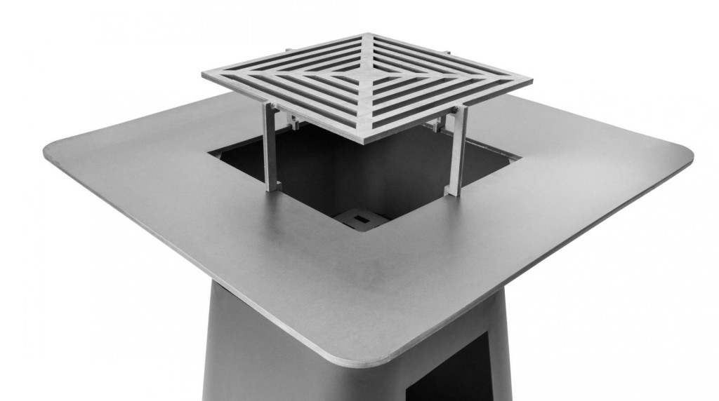 A grill felső része egy kihúzható hamutartóval ellátott kandallóból áll, és a grill domináns jellemzője a hatalmas grillezési felület - plancha vastagsággal. 1 cm-es, enyhén a közepe felé döntve.