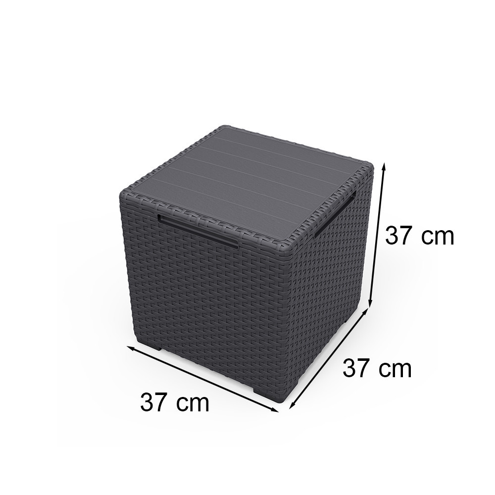 Méretek: 37 cm szélesség x 37 cm mélység x 37 cm magasságAnyag: Időjárásálló, UV-álló műanyagFunkcionalitás: Tárolóhelyként és asztalként funkcionálÖsszeszerelés: Egyszerű, gyorsKarbantartás: Karbantartásmentes, könnyen tisztíthatóAlkalmazás: Kültéri használatra tervezve