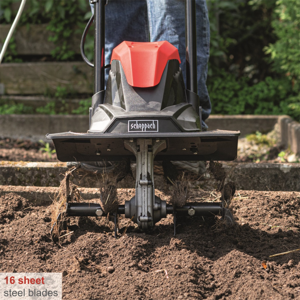 A Scheppach MTE 380 elektromos kapálógép ideális segítőtárs az ültetés előtti talaj előkészítéshez, talajlazításhoz, trágya, ill. más tápanyagok földbe juttatásához, vagy komposzt bedolgozásához. Kompakt méreteinek köszönhetően kisebb és közepes területekre, vagy üvegházakba, fóliasátorokba alkalmas. 16 speciálisan kialakított késsel, erős, 1050 W-os motorral, strapabíró fém szerkezettel, hosszú életartamú fém meghajtással, összecsukható ergonomikus tolószárral, kábeltartóval és biztonsági kapcsolóval van ellátva. Alacsony súlyának köszönhetően hölgyek is könnyedén kezelhetik. A halk motor lehetővé teszi a használatát akár sűrűbben lakott helyeken is.