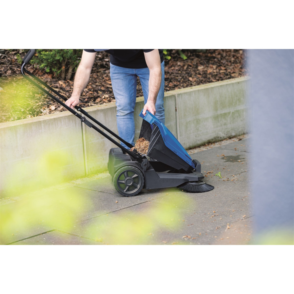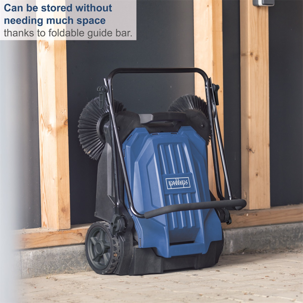 A Scheppach S 800 egy remek teljesítményű seprőgép, amely kategóriájában csúcsterméknek minősül. Felejtse el a hagyományos seprűt, hátfájást és fáradságos munkát. Ezzel a készülékkel még a sepregetés is szórakozás lesz. Az udvar, kocsibeálló, terasz, garázs vagy más felület a házban vagy a ház körül mindig példásan tiszták lehetnek, erőfeszítés nélkül. Ugyanakkor használhatja vállalkozásához is, tisztán tartani, vagy összetakarítani a munkahelyet. Az egyedi, szabadalmaztatott seprő rendszer két tartós oldalsó keféből és középső keféből áll. Az oldalsó keféknek köszönhetően, a gép könnyedén elbánik a sarkokban, peremek mentén vagy más, nehezebben megközelíthető helyeken található szennyeződésekkel is. A szemetet hatékonyan összegyűjti a nagy, 20 literes tartályába, így nincs szükség gyakori ürítésre. A 65 cm-es munkaszélességnek köszönhetően, óránként akár 2600 m2 tisztítható meg. A készülék alacsony súlyának hála, könnyen manőverezhető. Ergonomikus, teljesen összecsukható, puhított markolatú tolószárral rendelkezik. Kompakt méreteinek köszönhetően nem foglal sok helyet, főleg, hogy akár álló pozícióban is tárolható.