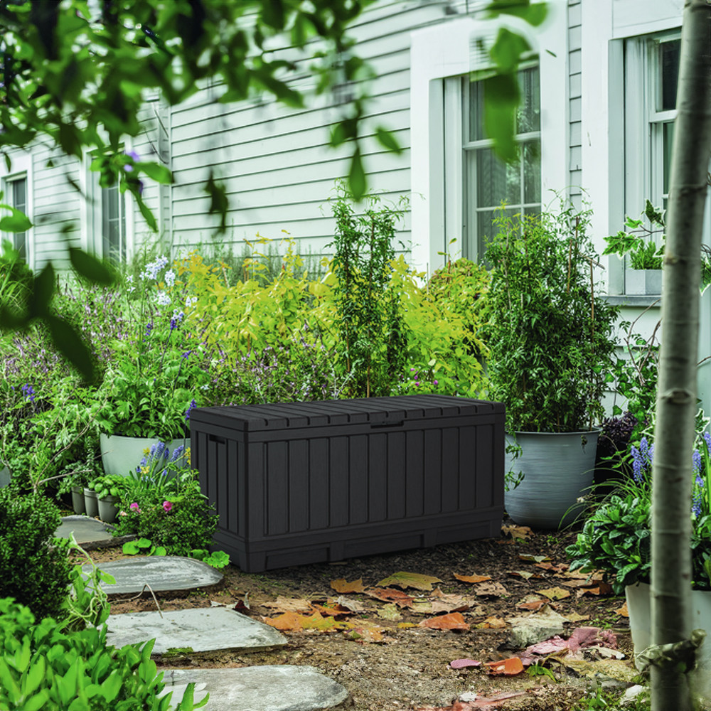 A Kentwood Storage Box 350L kettős célú elem: extra ülő- és tárolódoboz. Az erős és masszív fedél és doboz maximális szilárdságot és stabilitást biztosít, így kényelmes és biztonságos ülés 2 személy számára. Ideális tároló kerti kiegészítők, öntözőkannák, edények, párnák vagy kisebb kerti szerszámok és gyerekjátékok tárolására. A legjobb minőségű gyanta anyagból készült, hatékonyan védi a benne tárolt tárgyakat a nedvességtől, a szennyeződéstől és az UV sugárzástól.