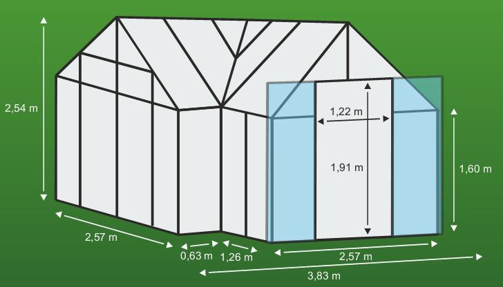 A csomag tartalmaz egy kétszárnyú tolóajtót (sz x ma = 1,22 x 1,91 m), lemezalapot, AL profilokat, üvegezést, 4x kézi nyitású tetőszellőző ablakot, 3 db ereszcsatorna ejtőcsövet, minden összekötő anyagot. Az üvegház építhető falazott (beton, egyéb) aljzatra, vagy horganyzott lemez alapra (a szállítási csomag tartalmazza). Számos extra standard tartozék vásárolható az üvegházhoz - polcok, állványok, kiegészítő szellőzőtető és oldalsó ablakok, automata nyitók ezekhez az ablakokhoz, ereszcsatorna készletek, hőmérők, nedvességmérők.