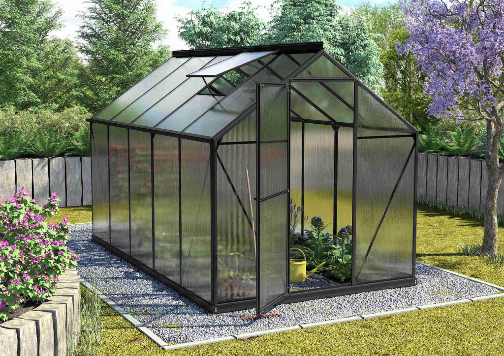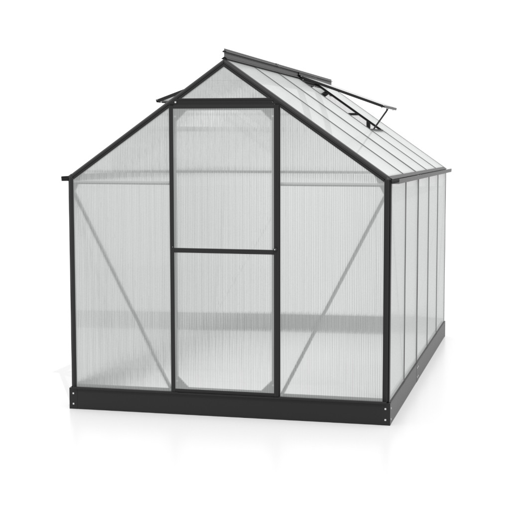 Alumínium üvegház, sz 1,98 x h 3,17 m, fekete, 2x tetőszellőző ablak, polikarbonát 6 mm, csuklós ajtó, 6,27 m2.