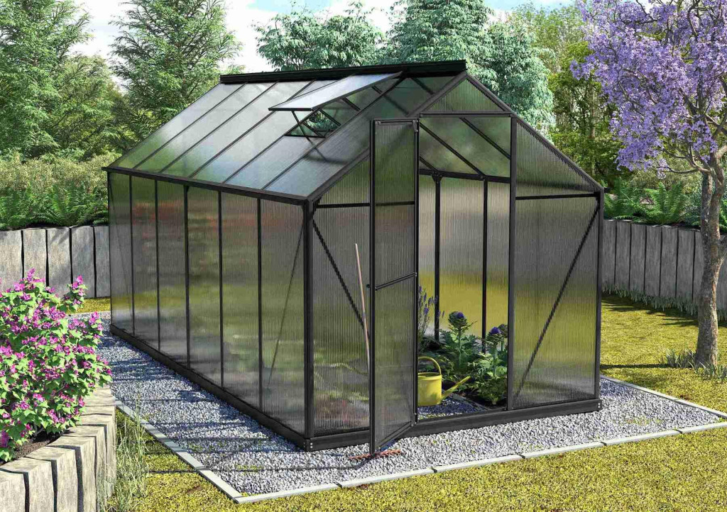 Alumínium üvegház, sz 1,98 x h 3,79 m, fekete, 2x tetőszellőző ablak, polikarbonát 6 mm, csuklós ajtó, 7,50 m2.