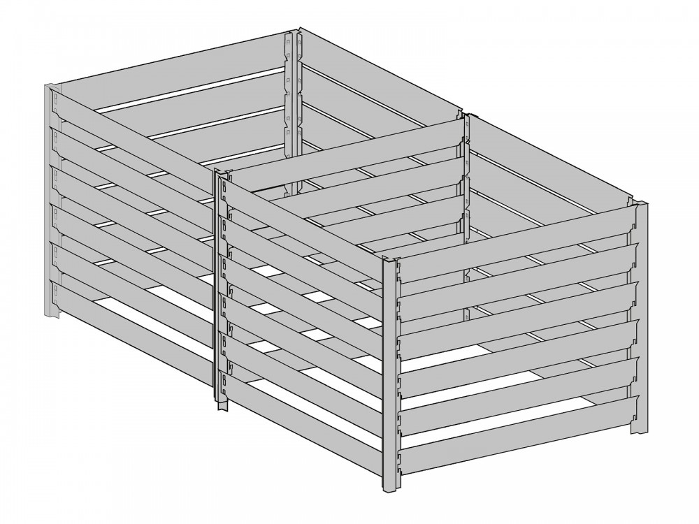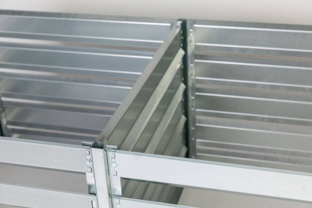 Érdekes kialakítású, tűzihorganyzott fémlemezből készült komposztáló. A komposztáló az egyszerű záraknak köszönhetően nagyon könnyen, szerszám nélkül össze- és szétszerelhető. Az érett komposzt kiválasztása nagyon egyszerű az ötletes kialakításnak köszönhetően. A komposztálónak nincs ajtaja vagy fedele; a profilok zárakból való kicsúsztatásával egy olyan nyílás jön létre, amelyen keresztül a komposztáló könnyen eltávolítható. A komposztáló minden oldalról hozzáférhető. A komposztáló különösen alkalmas nagyon nedves anyagok komposztálására, köszönhetően a burkolat teljes hosszában található levegőztető réseknek.