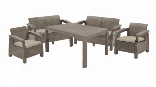 A Corfu Fiesta kerti bútor szett a Keter legnépszerűbb termékcsaládjából cappuccino színben felkelti a figyelmét a nem mindennapi dizájnjával természetes rattan utánzatban. Kiválóan kiegészít minden kertet, erkélyt, pergolát vagy teraszt függetlenül a környezet stílusától. A szerkezete erős és ellenáll a mindennapi kültéri használatnak.