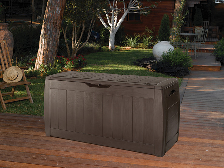 A barna színű Keter Hollywood kerti tárolódoboz kapacitása 270 liter. Kialakításával a vitage természetes fa padlólemezekre hasonlít. Tökéletesen kiegeszíti a modern és hagyományos környezetet is. A doboz nagy előnye az alacsony súlya és vízállósága.
