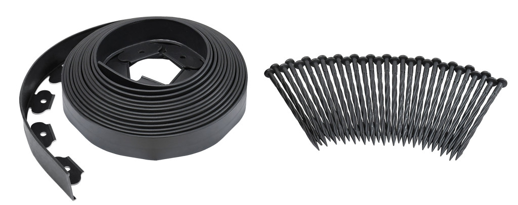 Az alapcsomag mindent tartalmaz. Mind a 10 m hosszú szegély, mind a 30 tüske a láthatatlan szegély biztonságos rögzítéséhez a talajhoz. A szegélyszalag alján lyukak találhatók, amelyekbe a mellékelt szegecseket behelyezi és beveri.