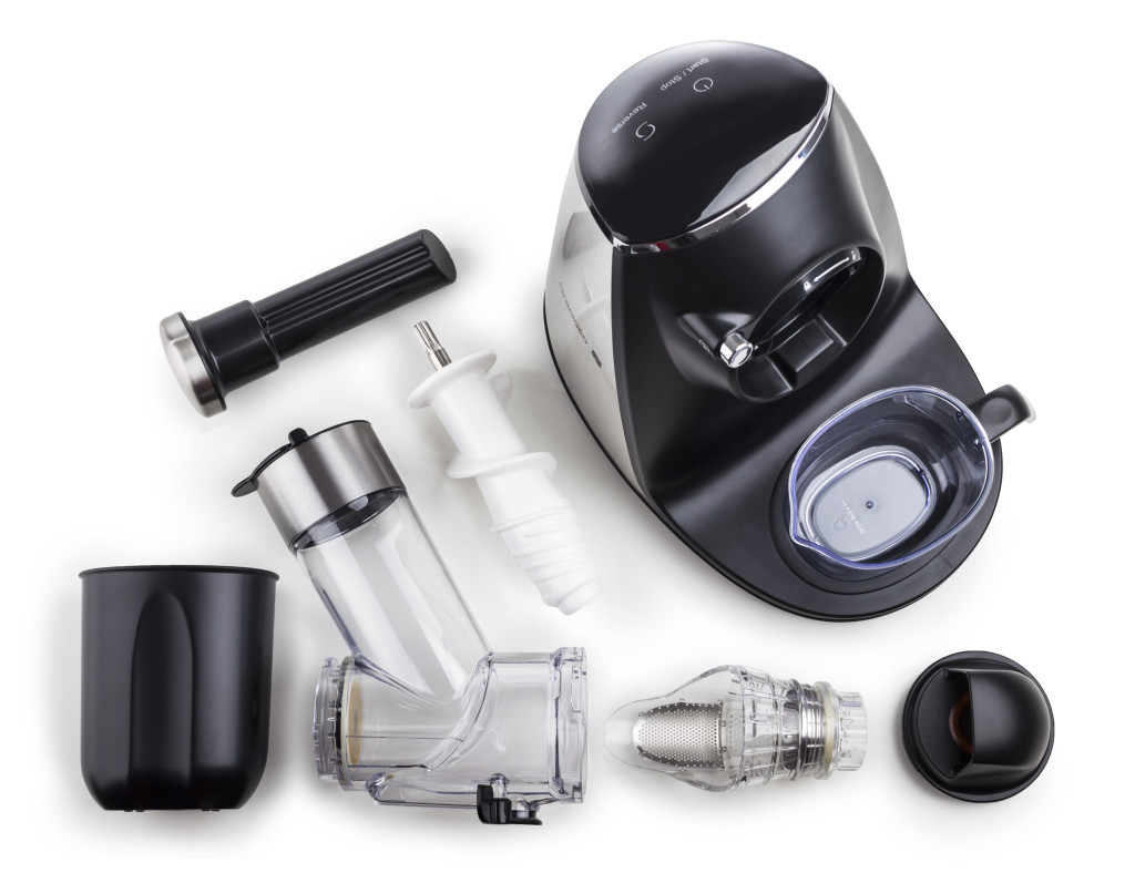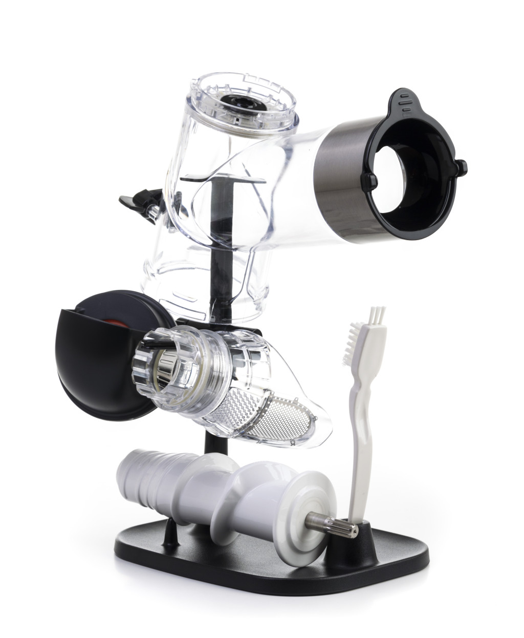 A G21 Gracioso gyümölcsprés nem egyedül megy, viszi magával a segédeit. A minőségi műanyag edény fogantyúval és fedővel pont illeszkedik a dzsúszt kibocsátó nyílás alá. A gyümölcshúsra pedig egy ellenálló műanyagból készült gyűjtőedényt kap. Természetesen nem hiányozhat a betolókar sem.