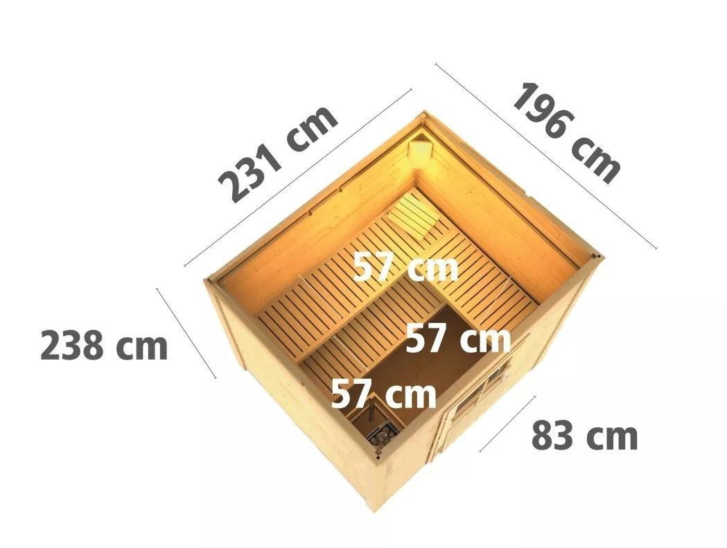 Finn szauna kültéri modellje kertjébe. A szauna 3 fekvő személy számára készült. Modern dizájn krómozott saroklécekkel. Gyártója, a németországi brémai KARIBU HOLZTECHNIK cég termékeivel sikeresen építette a skandináv szaunahasználat évszázados hagyományait, miközben beépítette a mai modern technológiákat. Bontott állapotban készletben szállítjuk, ahol a falak egyedi faprofilokból készülnek, amelyeket egyszerűen össze kell rakni és összecsavarozni. Ez garantálja az egyszerű összeszerelést, amelyet bármely barkácsoló meg tud kezelni. A szauna falai speciálisan simított deszkákból állnak, dupla csappal és horonnyal, ami rendkívüli fugaszilárdságot garantál. Hogy a szauna belsejéből ne szökjön ki a hő, egy második mennyezet kerül beépítésre, amely vázszerkezetből készül, 42 mm vastag ásványi szigetelőgyapottal.
