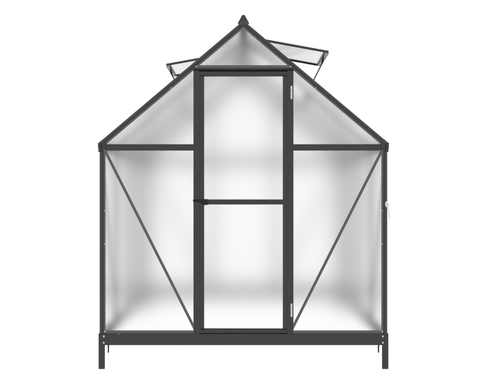 Alumínium üvegház, sz 1,82 x mé 2,43 m, fekete, 2x felülvilágító, 4 mm polikarbonát, csuklós ajtó, terület 4,42 m2.