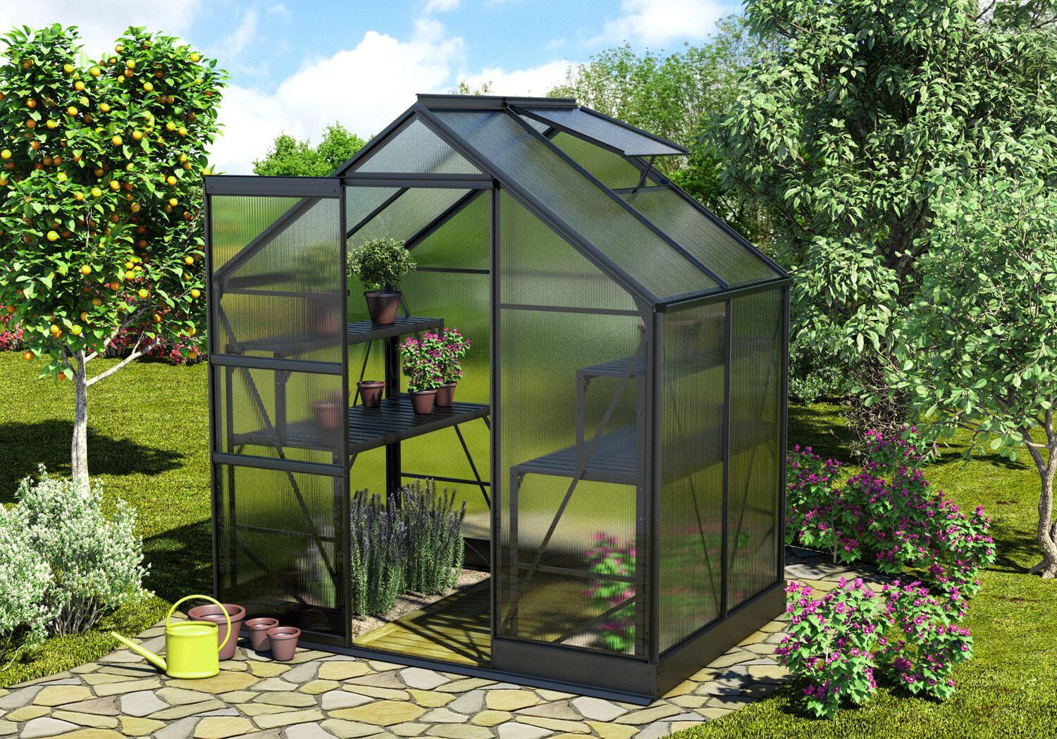 Alumínium üvegház, sz 1,95 x h 1,37 m, fekete színű, 1x tetőszellőző ablak, 6 mm polikarbonát, horganyzott alap, terület 2,67 m2.