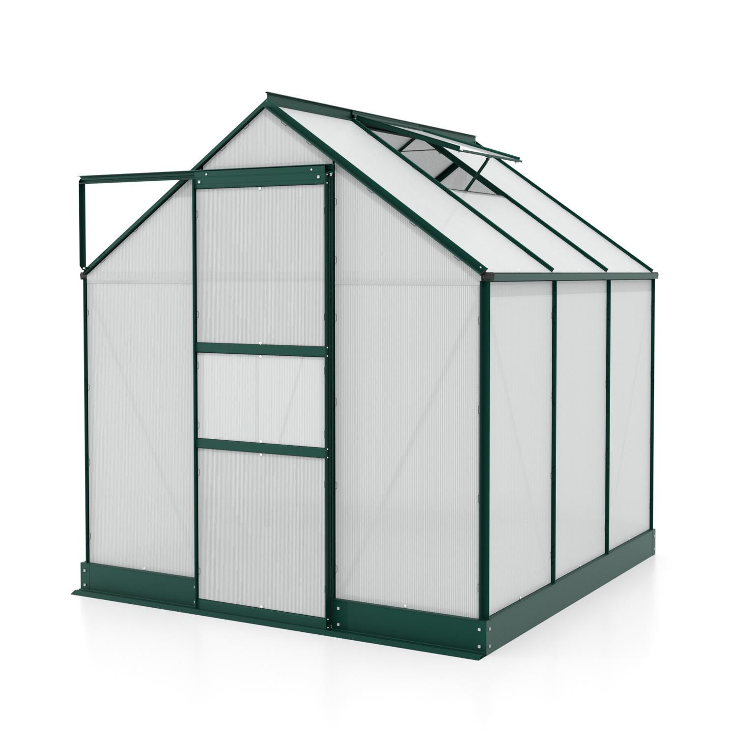 Alumínium üvegház, sz 1,95 x h 1,99 m, zöld színű, 1x tetőszellőző ablak, 6 mm polikarbonát, horganyzott alap, terület 3,88 m2.