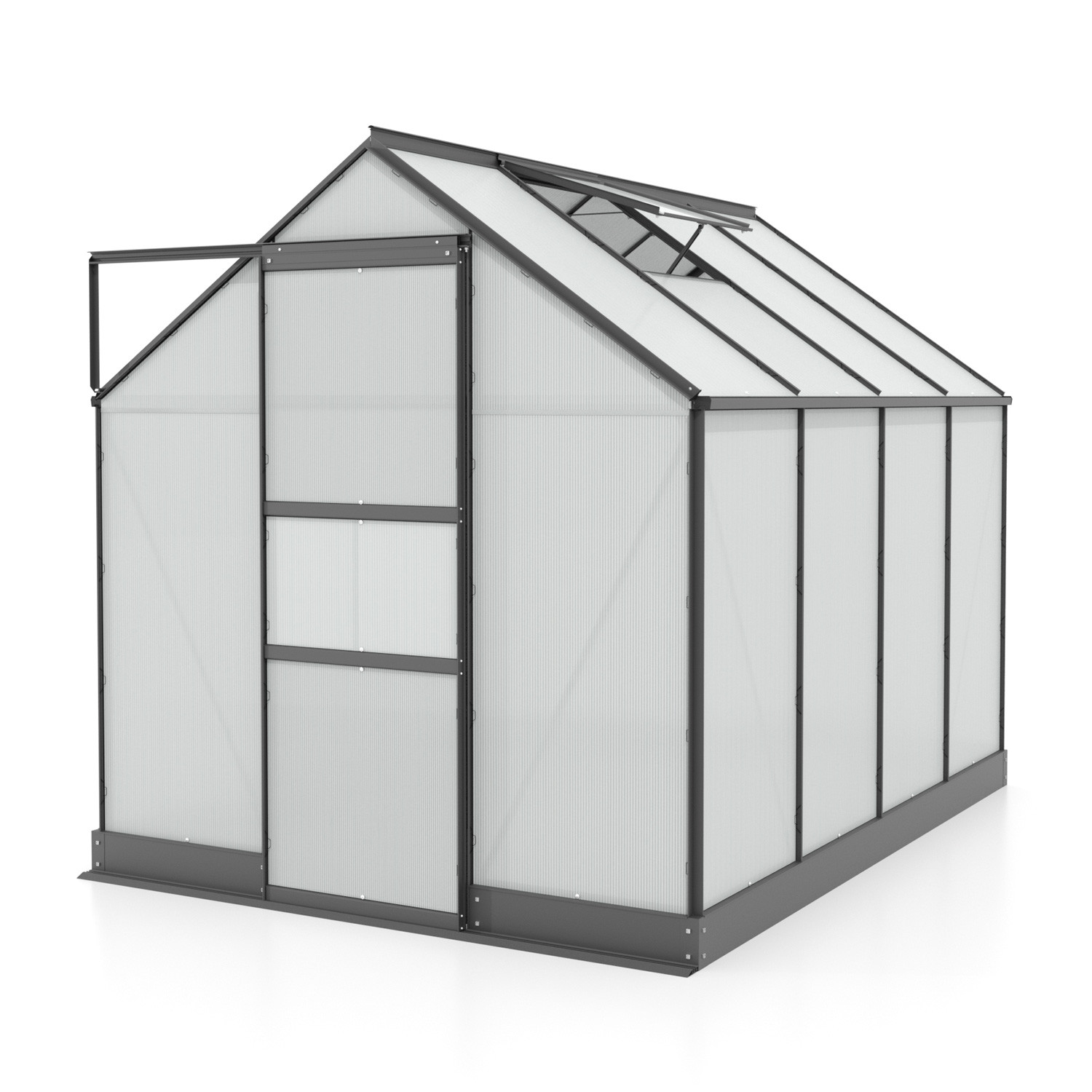 Alumínium üvegház, sz 1,95 x h 2,61 m, fekete színű, 1x tetőszellőző ablak, 4 mm polikarbonát, horganyzott alap, terület 5,09 m2.