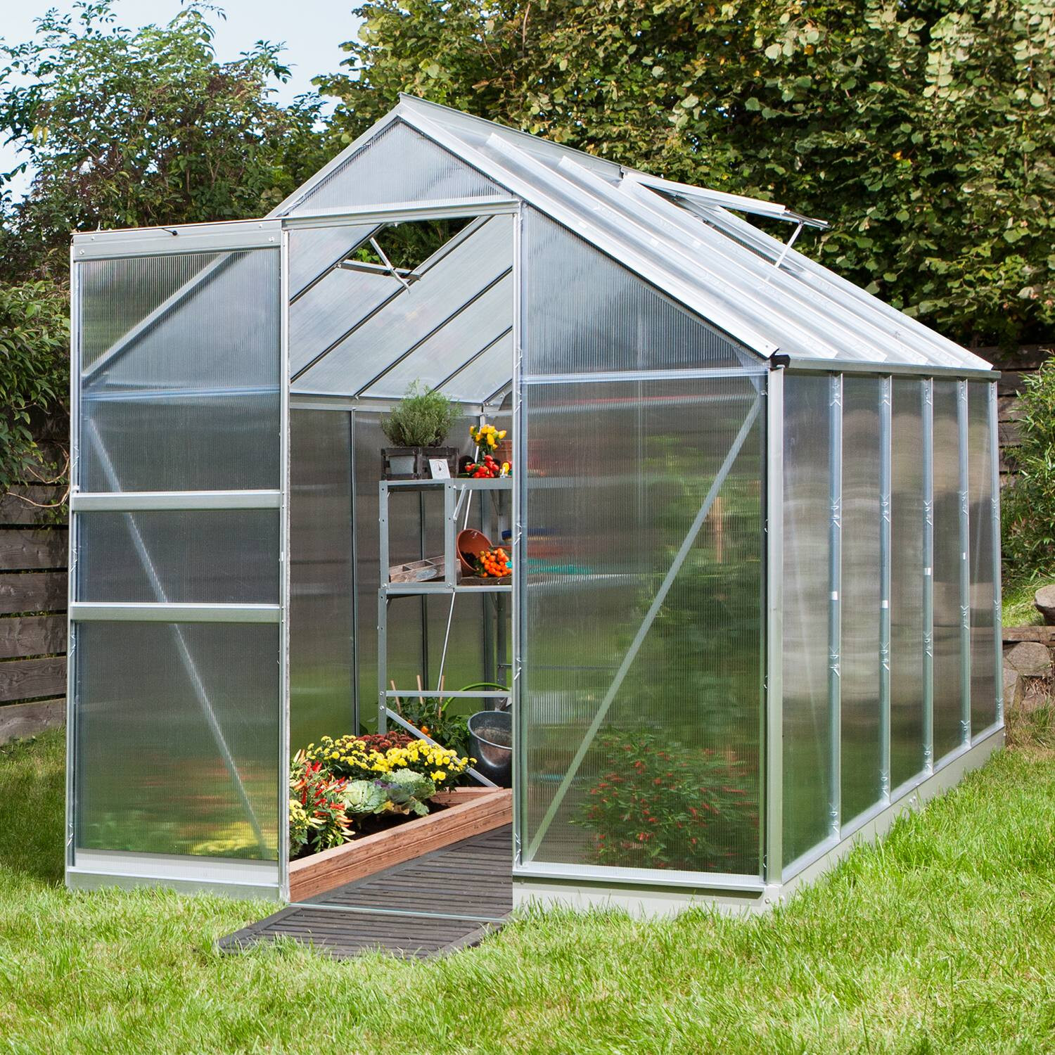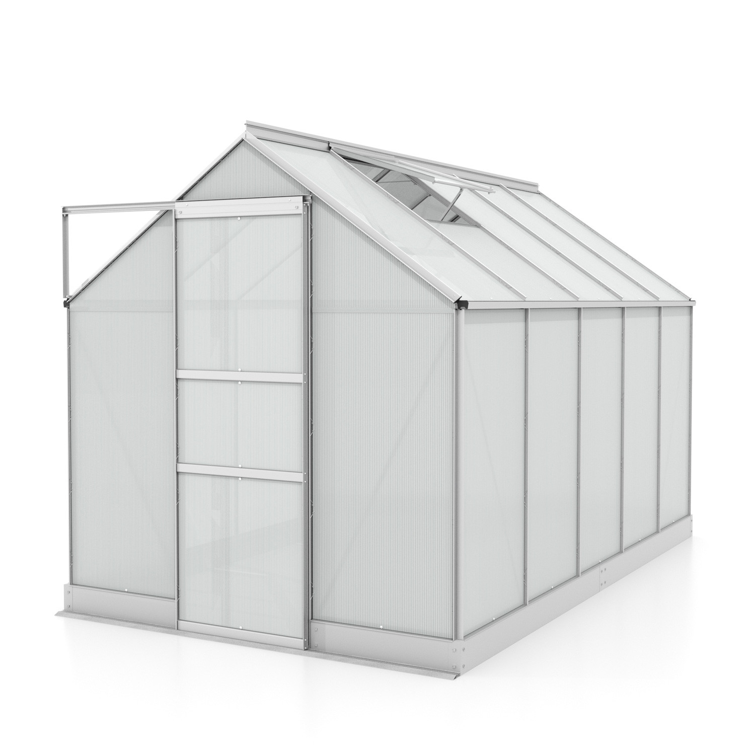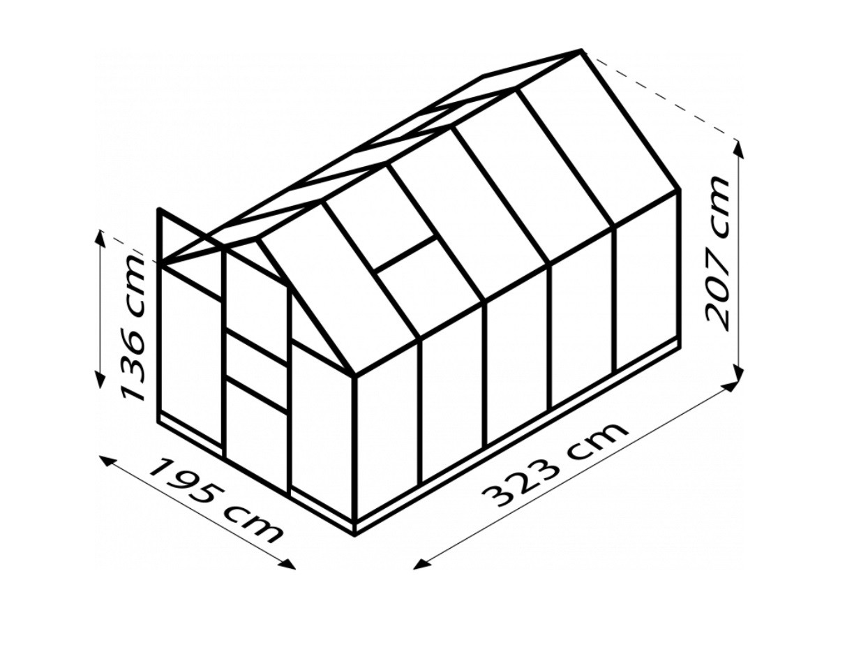 A csomag tartalmaz egyszárnyú tolóajtót (sz x ma = 0,61 x 1,74 m), AL profilokat, üvegezést, horganyzott acél talpat, 2x kézi nyitású tetőszellőző ablakot, minden rögzítőelemet. Az üvegházhoz számos tartozék vásárolható - polcok, állványok, másik szellőző tetőablak, automata nyitó, ereszcsatorna készletek, hőmérők, páratartalommérők.