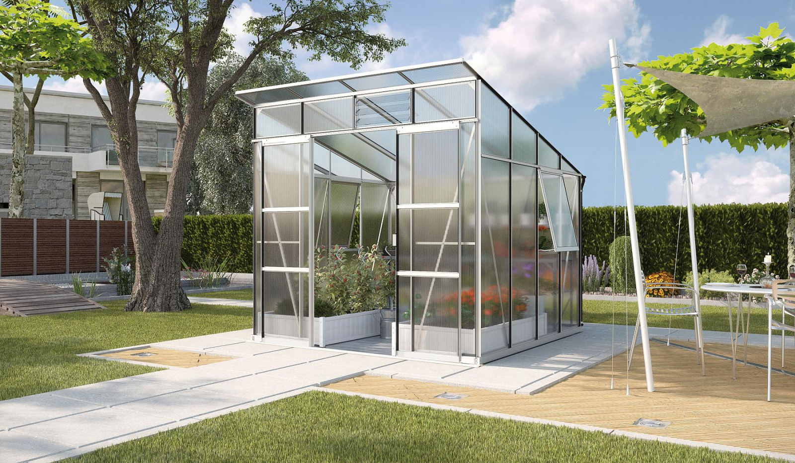 Ennek az üvegháznak a nagy előnye a rendkívül alacsony küszöb, így könnyen használható, így akár kerti talicskával is könnyedén behajthat az üvegházba.