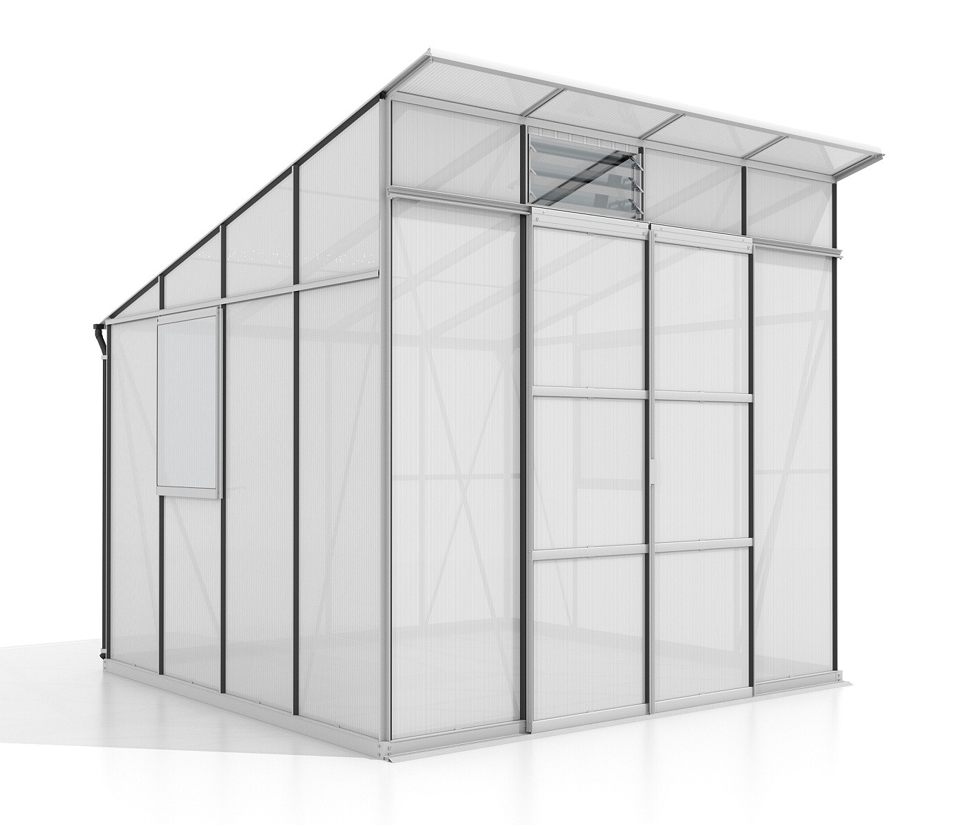 A csomag tartalma egy kétszárnyú tolóajtó (sz x ma nyílás = 1,22 x 1,92 m), alumínium profilok, üvegezés, 2x oldalsó + 1x elülső lamellás ablak kézi nyitással, 1x ereszcsatorna két lefolyócsővel, valamint az összes rögzítőelem. Számos extra kiegészítő megvásárlására van lehetőség az üvegházhoz - polcok, állványok, kiegészítő szellőzőtető és oldalsó ablakok, automata nyitók ezekhez az ablakokhoz, ereszcsatorna-készletek, hőmérők, higrométerek.